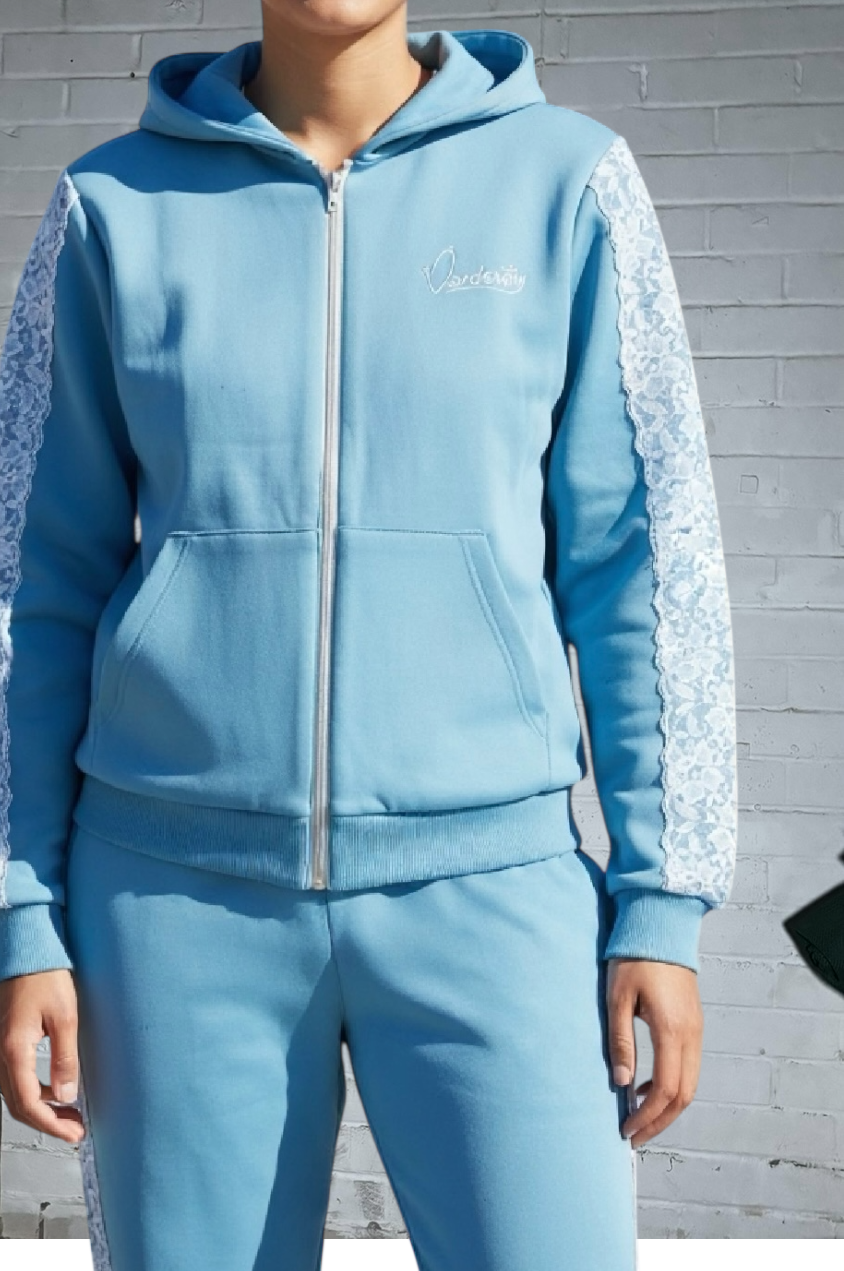 Sky Blue Tracksuit with Lace Detailing and our Signature Satin Lined Hood